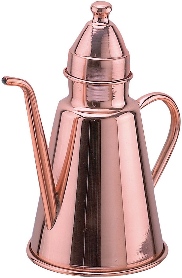 Descrizione: Oliera in rame con coperchio e orlo salva gocce