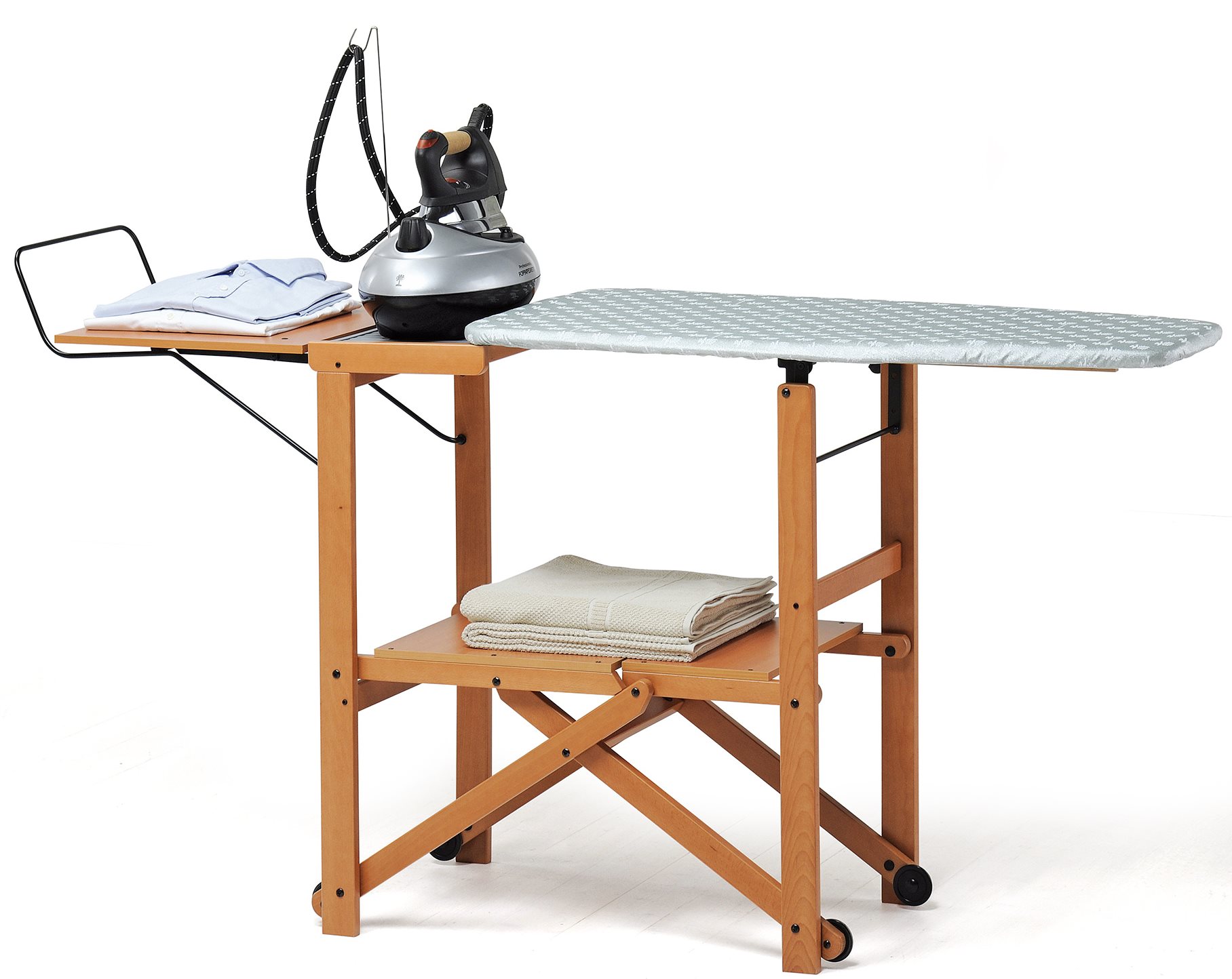 Descrizione: Asse da stiro in legno massiccio, dotato di portabiancheria e sede per il ferrro da stiro