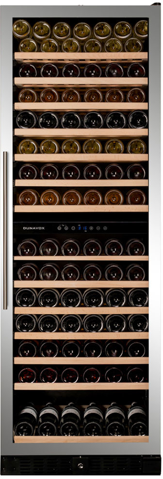 Cantinetta a due zone di temperature capace di contenere 166 bottiglie bordolesi standard. Porta vetrata disponibile in finitura acciaio inox oppure full glass nera. La versione DSS compende anche la maniglia in acciaio inox. Le bottiglie vengono posizionate su ripiani in legno estraibili e removibili incastonati in un mervaglioso interno azzurro.