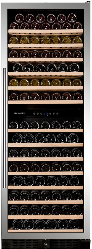 La cantinetta a 2 temperature più capiente prodotta da Dunavox. Il suo aspetto elegante viene dato dalla porta "full glass" senza cornice e con l'impugnatura in acciaio inox che lo rendono adatto al posizionamento in una grande cucina, enoteca o ristorante. Le bottiglie vengono posizionate su ripiani in legno scorrevoli. Le 2 zone di temperatura possono essere facilmente regolate e controllate dal pannello digitale interno che funge anche da divisorio.