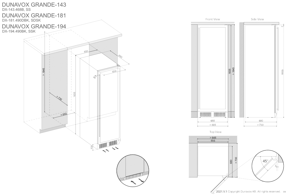 La cantinetta può sia essere inserita nei mobili grazie all'autoventilazione nello zoccolo (vedi schema tecnico), sia essere installata a posizionamento libero.