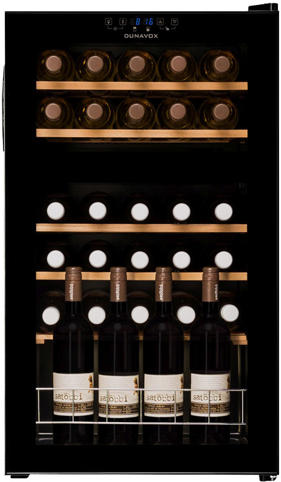 Cantinetta con due temperature adatta per il servizio di vini bianchi e rossi. Le bottiglie vanno posizionate su robusti ripiani in legno. Il prodotto è dotato anche di una griglia cromata per poter posizionare le bottiglie in verticale nella zona in basso. Regolazione temperature tramite display digitale, illuminazione interna a LED. La differenza massima di temperatura tra le 2 zone non deve superare i 5°C. La capacità massima di carico è di 30 bottiglie bordolesi standard.