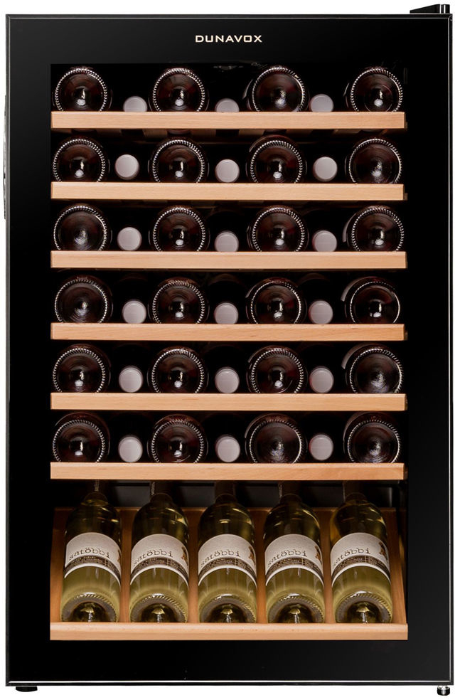 Questa cantinetta è dotata di compressore il cui circuito è controllato da un termostato analogico. Le bottiglie vengono posizionate sugli eleganti ripiani in legno. Utilizzando il ripiano inferiore da presentazione la capacità massima è di 40 bottiglie, mentre se viene installata la ringhierina cromata al posto del ripiano da presentazione la capacità massima raggiunge le 48 bottiglie.