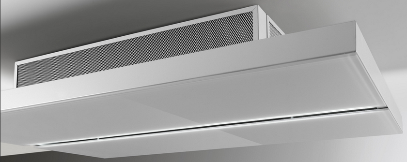 Descrizione: Cappa a soffitto in vetro bianco, luce a LED, telecomando