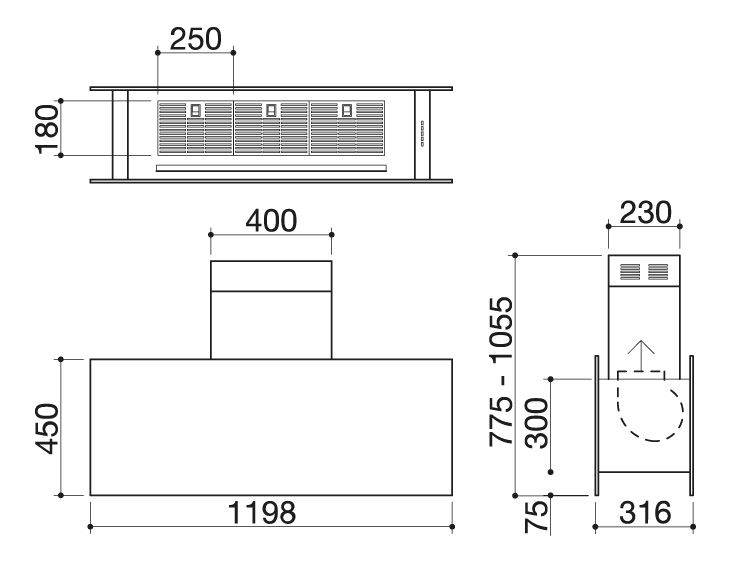 • uscita aspirazione: ø 150 mm + riduttore ø 120 mm