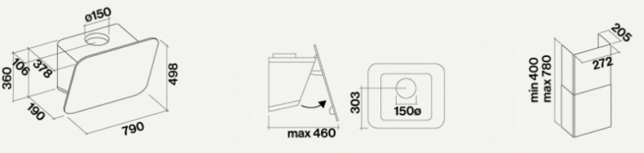 Descrizione: Cappa a parete apribile, illuminazione a Led, pulsantiera elettronica, 800 mc/h