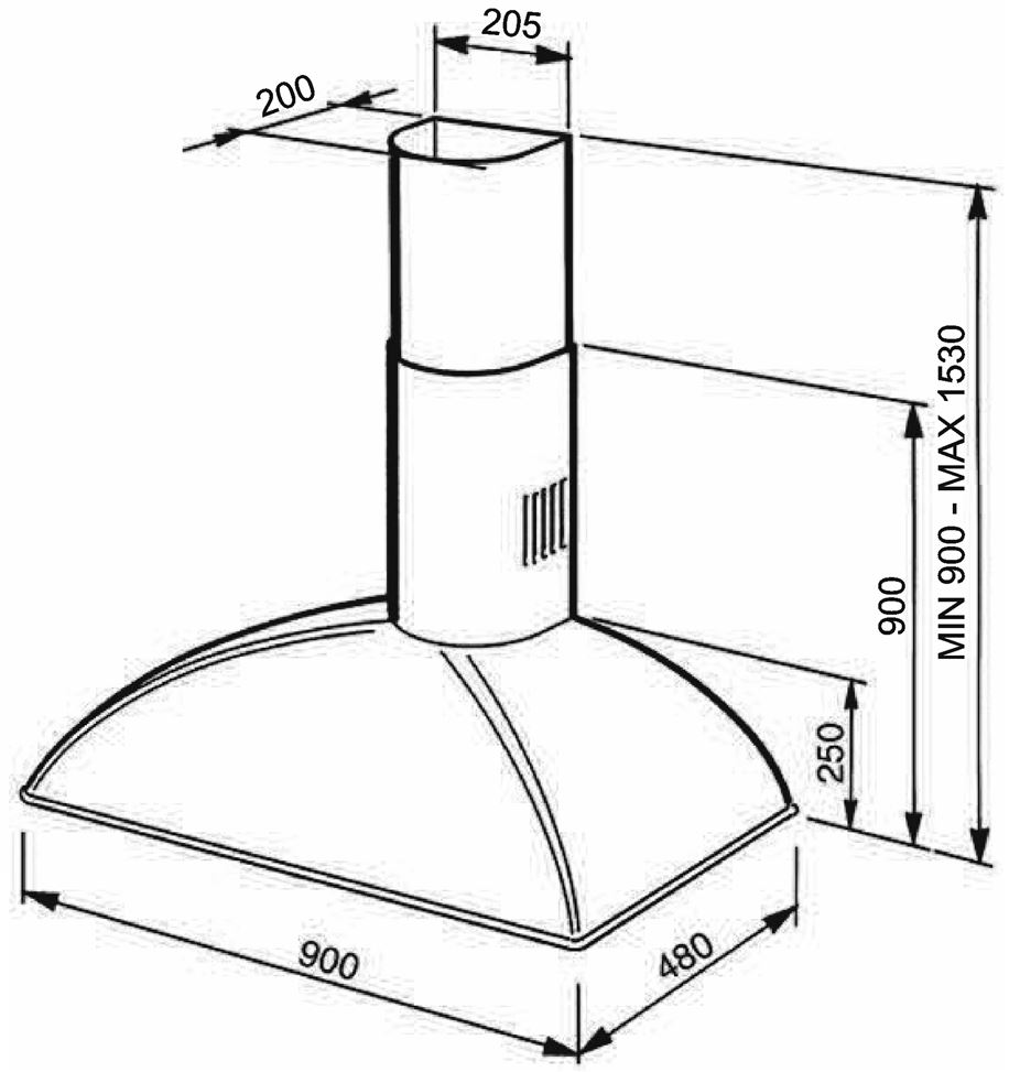 Descrizione: Cappa a parete Trapezio, 90 cm, Estetica Coloniale, potenza 275 W, luci a led, classe A