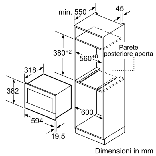- Dimensioni nicchia (AxLxP): 560 mm - 568 mm x 362 mm - 382 mm x 300 mm