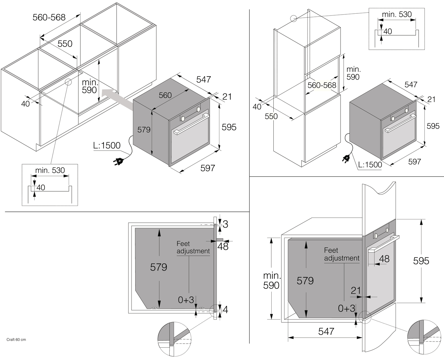 - Larghezza minima della nicchia: 560 mm