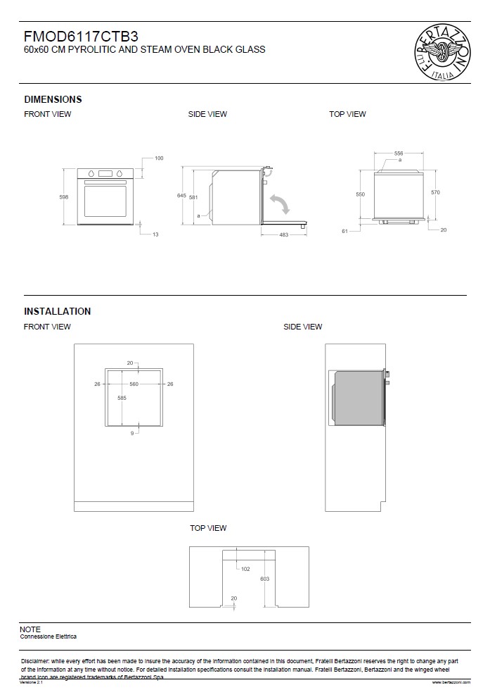 Cavità forno Volume totale 76 L Misura 60 cm Alimentazione forno elettrico Tipo forno total steam / pirolitico Tipo grill forno elettrico Livelli di cottura 5 Programmi di cottura pre-impostati Bertazzoni Assistant Modi cottura: Bertazzoni Assistant / clean / convezione / elettrico ventilato / funzioni speciali / grill / grill ventilato / pre-riscaldamento veloce / resistenza inferiore / resistenza superiore e inferiore / total steam / turbo Funzioni speciali: eco / scongelamento / mantenimento calore / disidratazione / lievitazione / sabbath Volume forno 76 L Comandi forno touch TFT display Tipo porta quadruplo Vetro interno removibile sì Finitura cavità smalto grigio pirolitico Timer: fine cottura / inizio cottura / tempo cottura Sonda carne sì Cerniere ammortizzata Air fryer sì Guide telescopiche 1 Griglie forno 1 heavy duty inox Vassoio 1 vapore inox + 1 smaltato + 1 profondo smaltato + 1 griglia vassoio + 1 cestello air fry Luce forno doppio Sistema autopulente hydro cleaning (funzione vapore) e Pyrolitic cleaning (funzione eco)