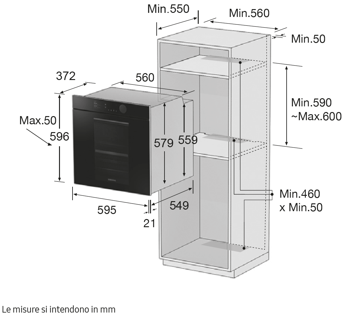 - Dimensioni vano incasso in mm (LxAxP) 560x572x549