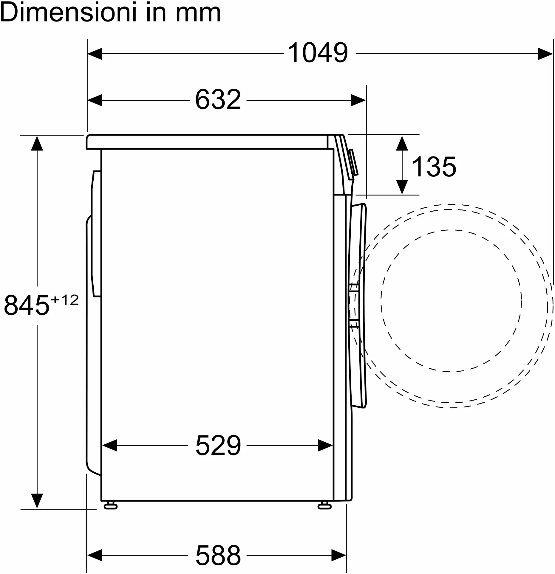 - Profondità con porta aperta a 90 gradi: 1049 mm