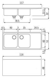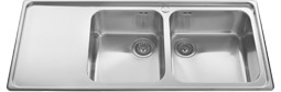 Descrizione: Lavello da incasso semifilo in acciaio inox con due vasche ed un gocciolatoio liscio, cm 117, foro rubinetteria di serie