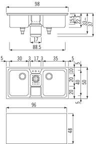 - Piano lavaggio multifunzione da incasso in acciaio inox a due vasche e una bacinella