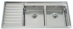 Descrizione: Lavello acciaio incasso 2 vasche, 1 gocciolatoio, filo piano, cm 117, raggio 12, profondità 51 cm, foro rubinetteria