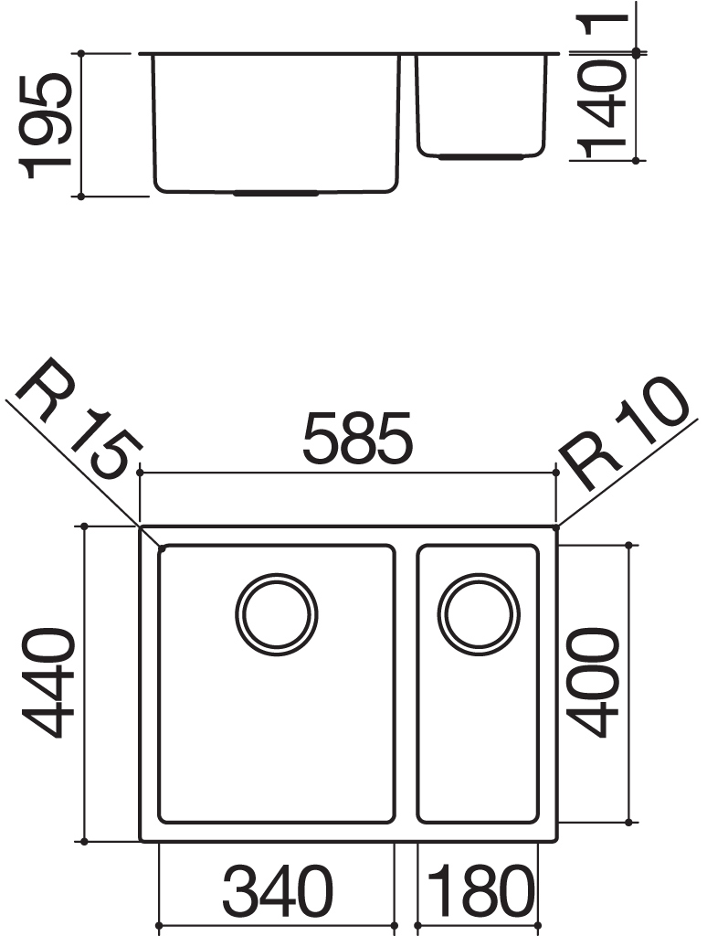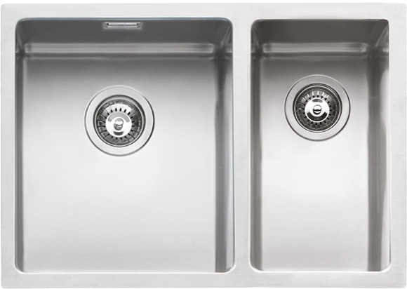 Descrizione: Lavello doppia vasca quadra in acciaio inox da incasso, filo e sottotop, cm 58