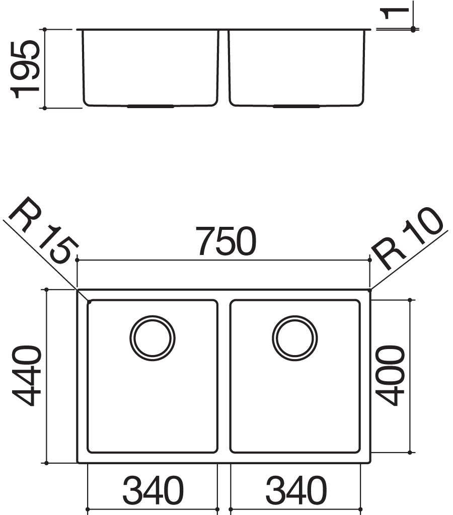 Descrizione: Lavello doppia vasca quadra in acciaio inox da incasso, filo e sottotop, cm 75