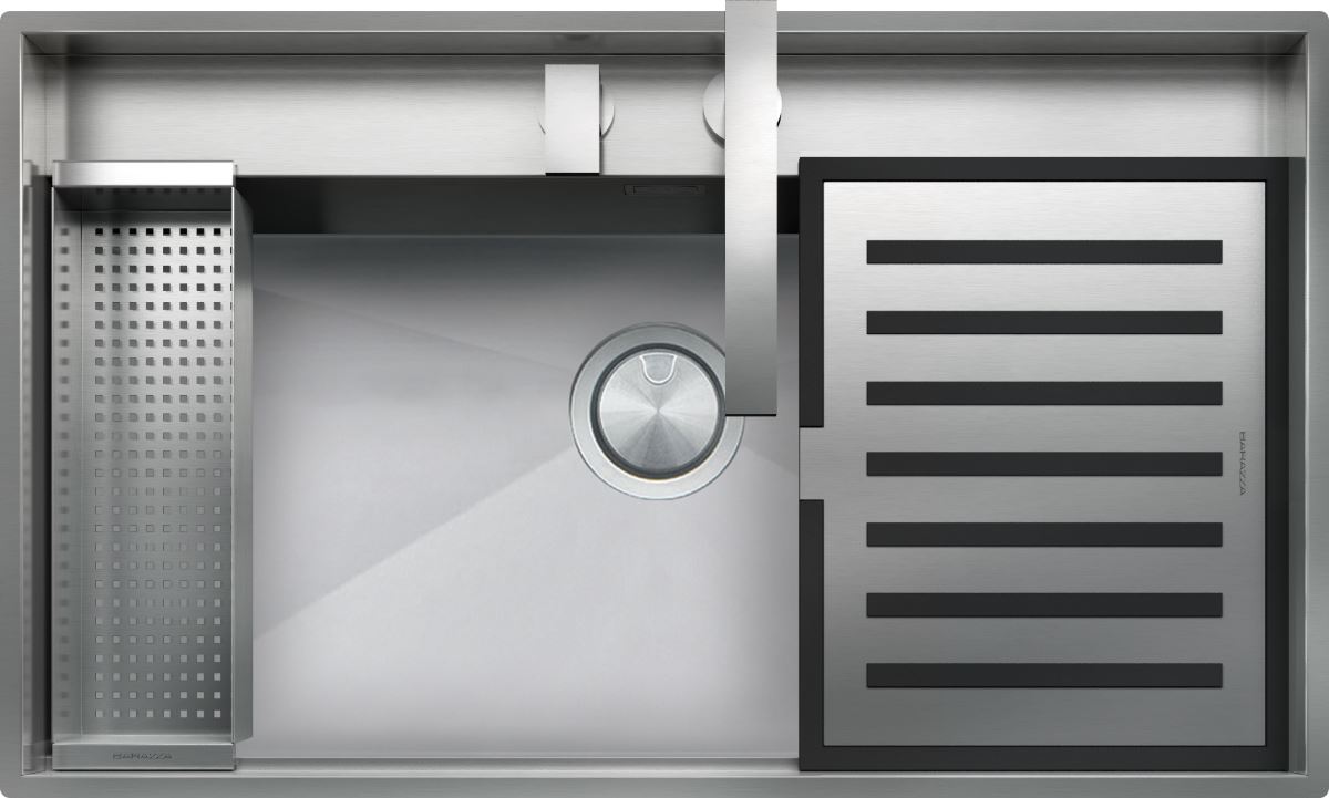 - Accessori inclusi nel modello 1LLB91K: tagliere rettangolare in acciaio inox e HPL nero 1TBF, vaschetta forata inox 1VBF, rubinetto miscelatore B_Free Abbattibile con comando remoto 1RUBMBFA