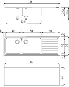 Descrizione: Lavello da incasso in acciaio inox a due vasche grandi e un gocciolatoio cm 148