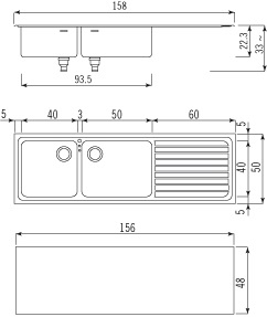 Descrizione: Lavello da incasso in acciaio inox a due vasche e un gocciolatoio cm 158