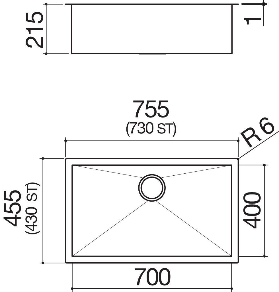 Descrizione: Vasca quadra in acciaio inox da incasso, filo e sottotop, cm 70, R.0