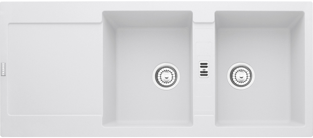 Descrizione: Lavello in Fragranite serie Maris, 116 cm, per base da 80 cm, due vasche e un gocciolatoio