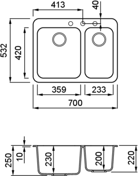Descrizione: Lavello a 2 vasche 70x53 cm
