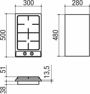 Descrizione: Piano cottura a gas, 2 fuochi, 30 cm, Linea Vega, griglie e spartiamma smaltati