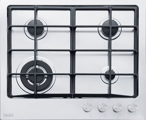 Descrizione: Piano cottura a gas valvolato, inox satinato, cm 60, 4 fuochi, griglie ghisa