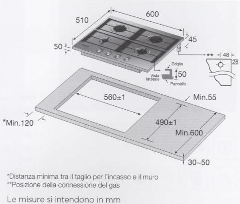 Descrizione: Piano cottura a gas valvolato in acciaio, 60 cm, 4 fuochi, griglie ghisa