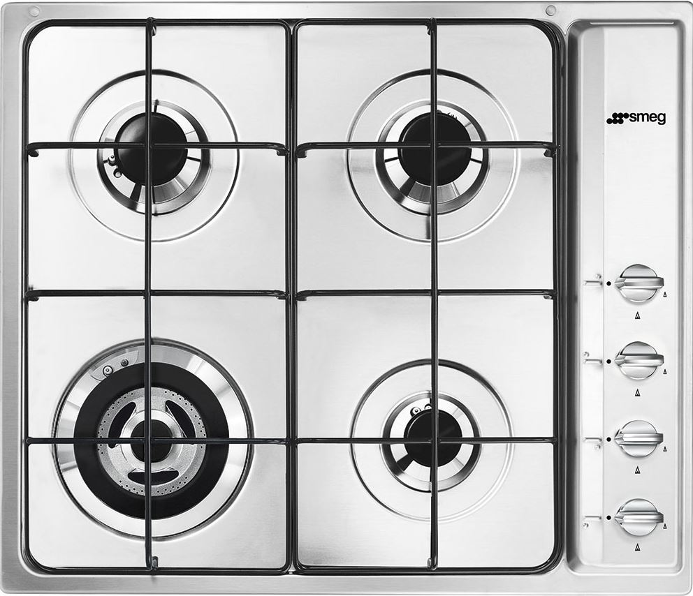 Descrizione: Piano cottura a gas valvolato inox, 4 fuochi, 60 cm, comandi laterali, griglie smaltate