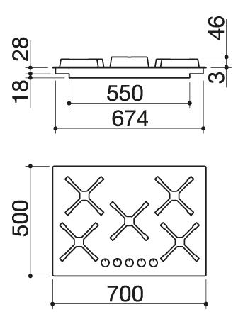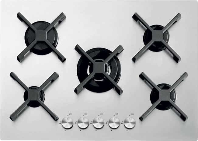 Descrizione: Piano cottura a gas valvolato, 70 cm, 5 fuochi 1 a tripla corona, griglie e spartifiamma in ghisa, acciaio inox