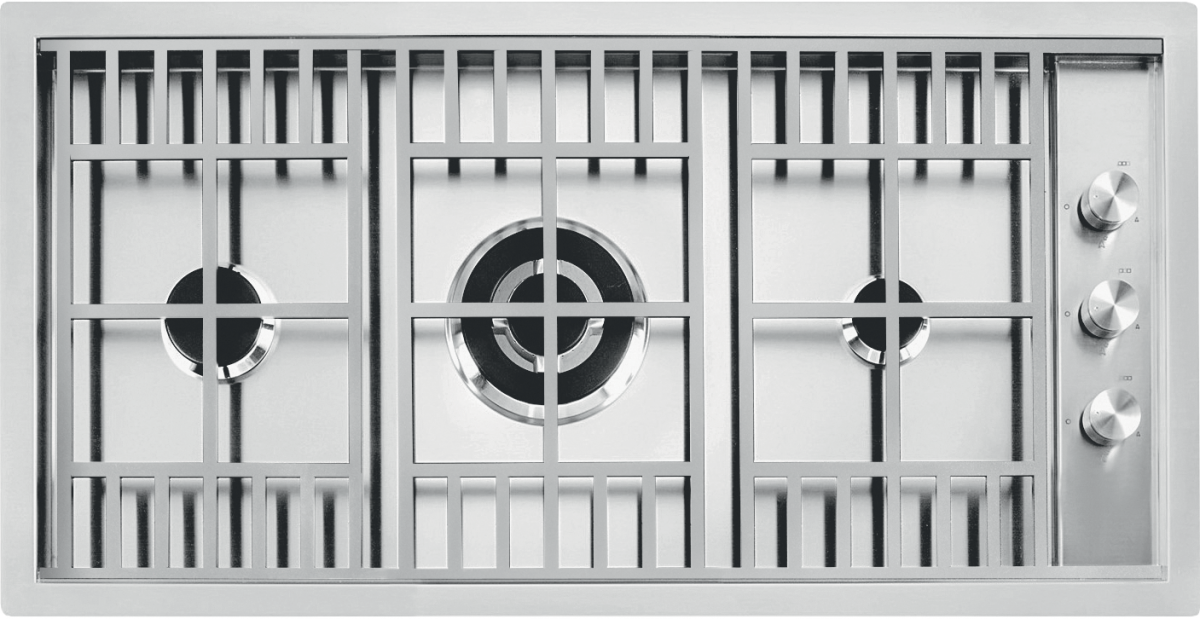 Descrizione: Piano cottura Lab a gas valvolato in acciaio incasso e filo, cm 90, 3 fuochi, comandi laterali