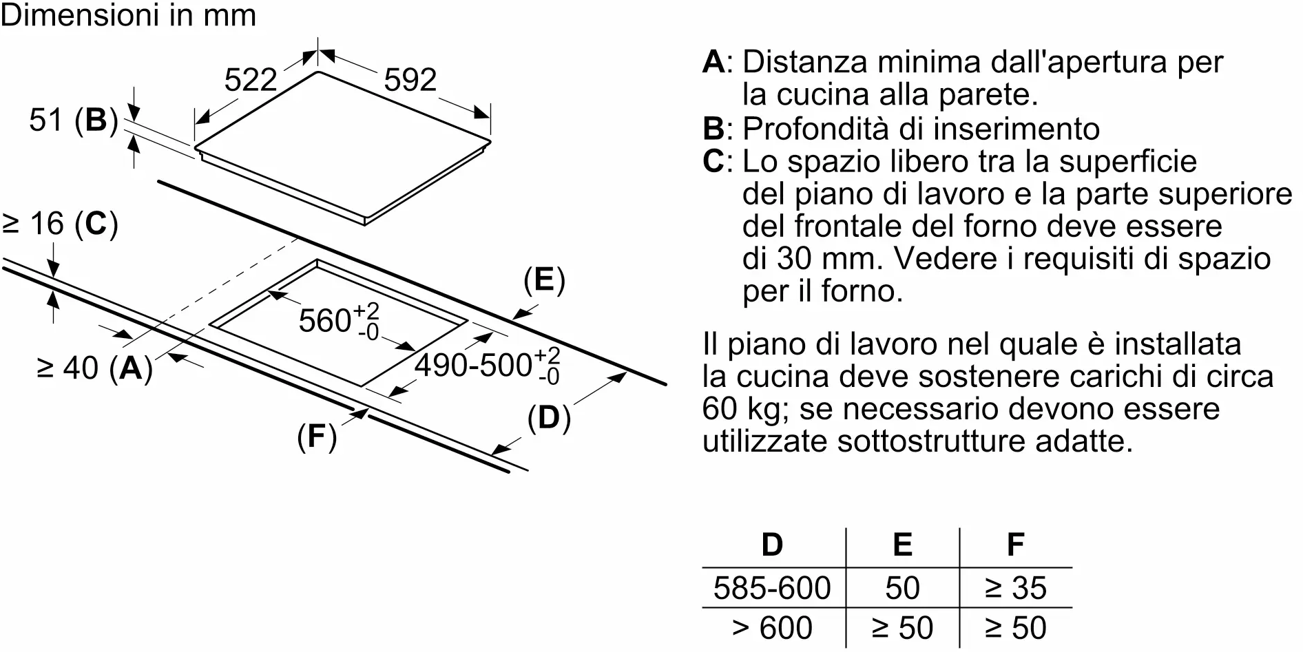 - Dimensioni del vano per l'installazione (AxLxP): 51 x 560-560 x 490-500 mm