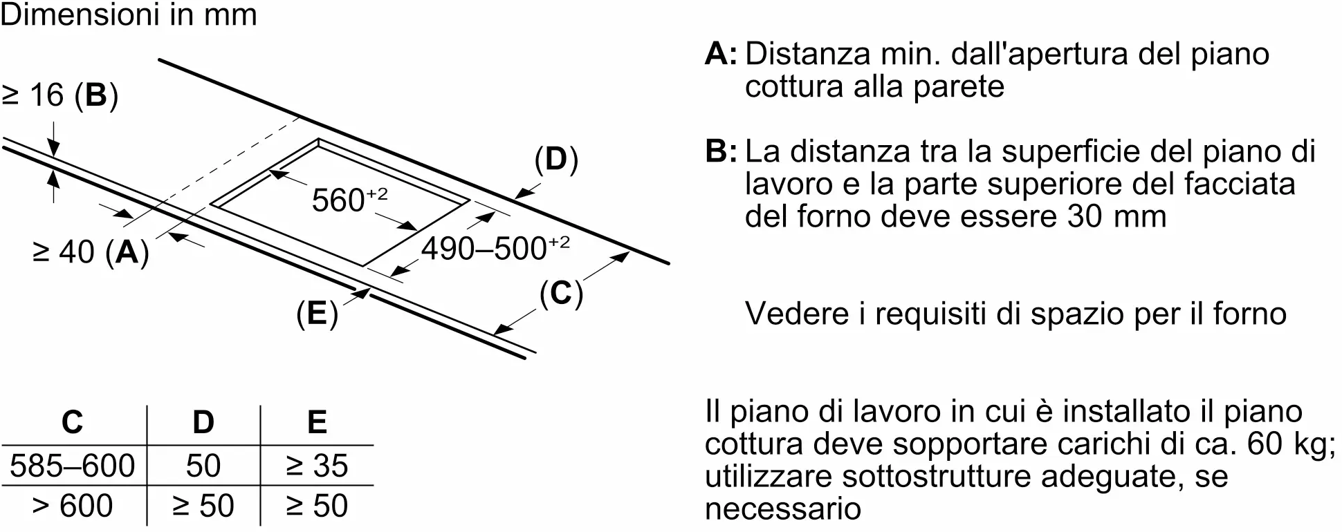 - Dimensioni del vano per l'installazione (AxLxP): 55 x 560-560 x 490-500 mm