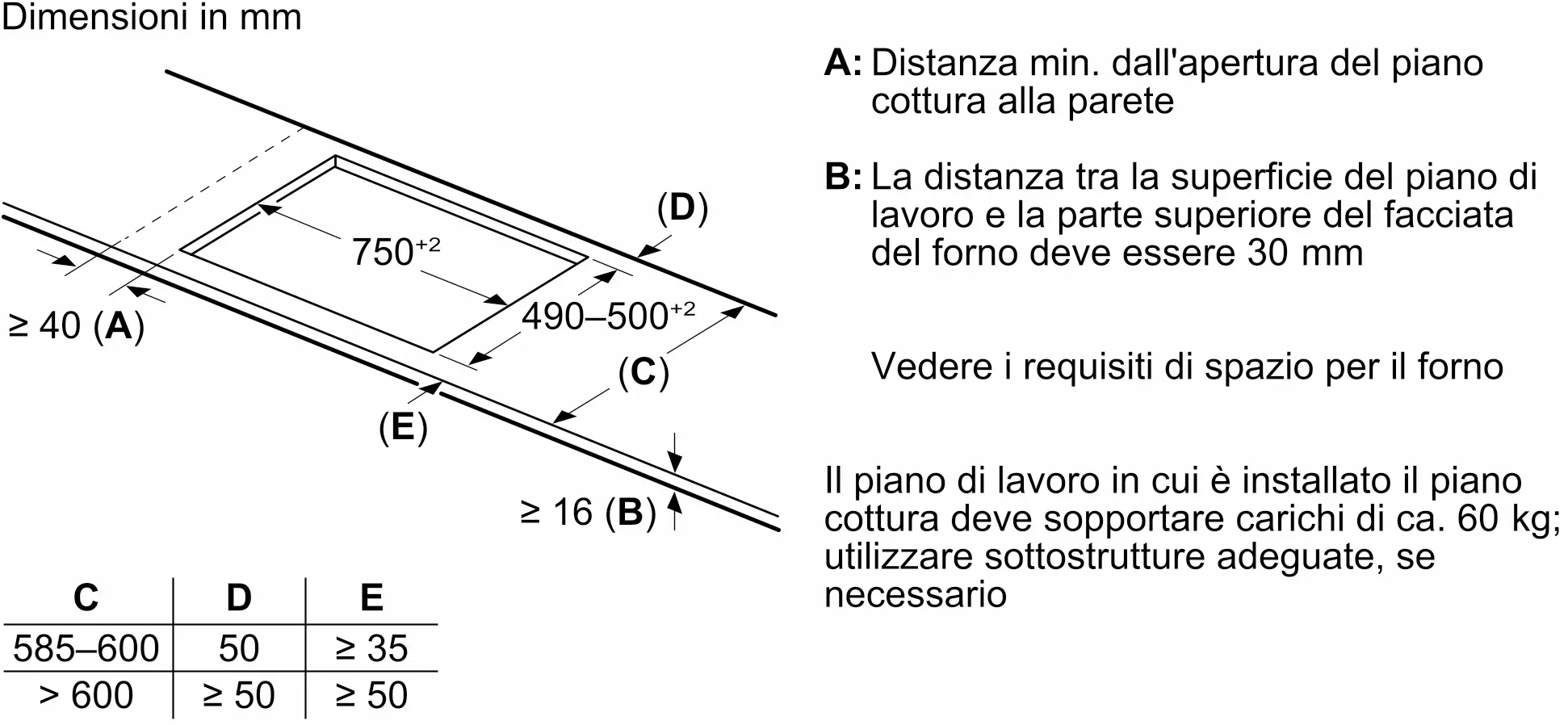- Dimensioni del vano per l'installazione (AxLxP): 51 x 750-750 x 490-500 mm
