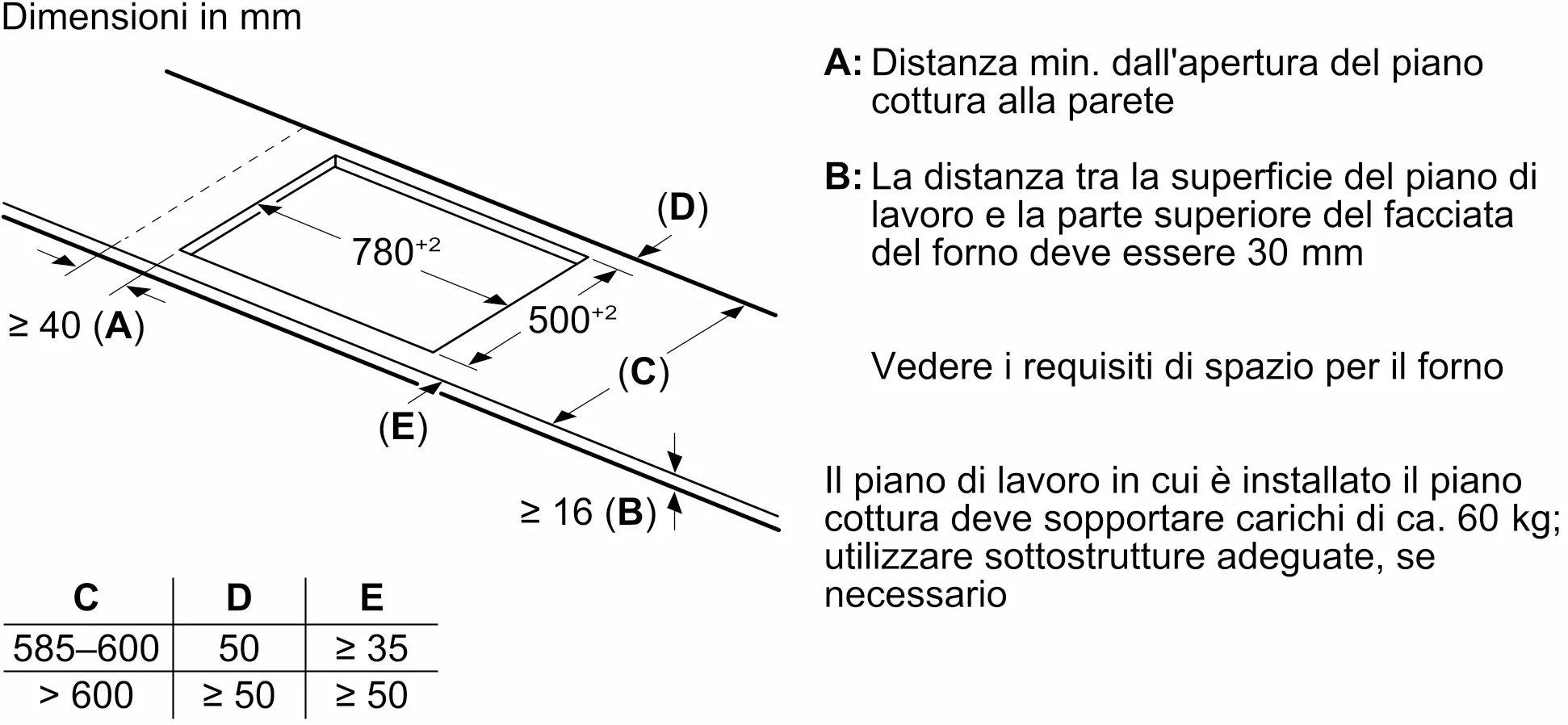 - Dimensioni del vano per l'installazione (AxLxP): 55 x 780-780 x 500-500 mm