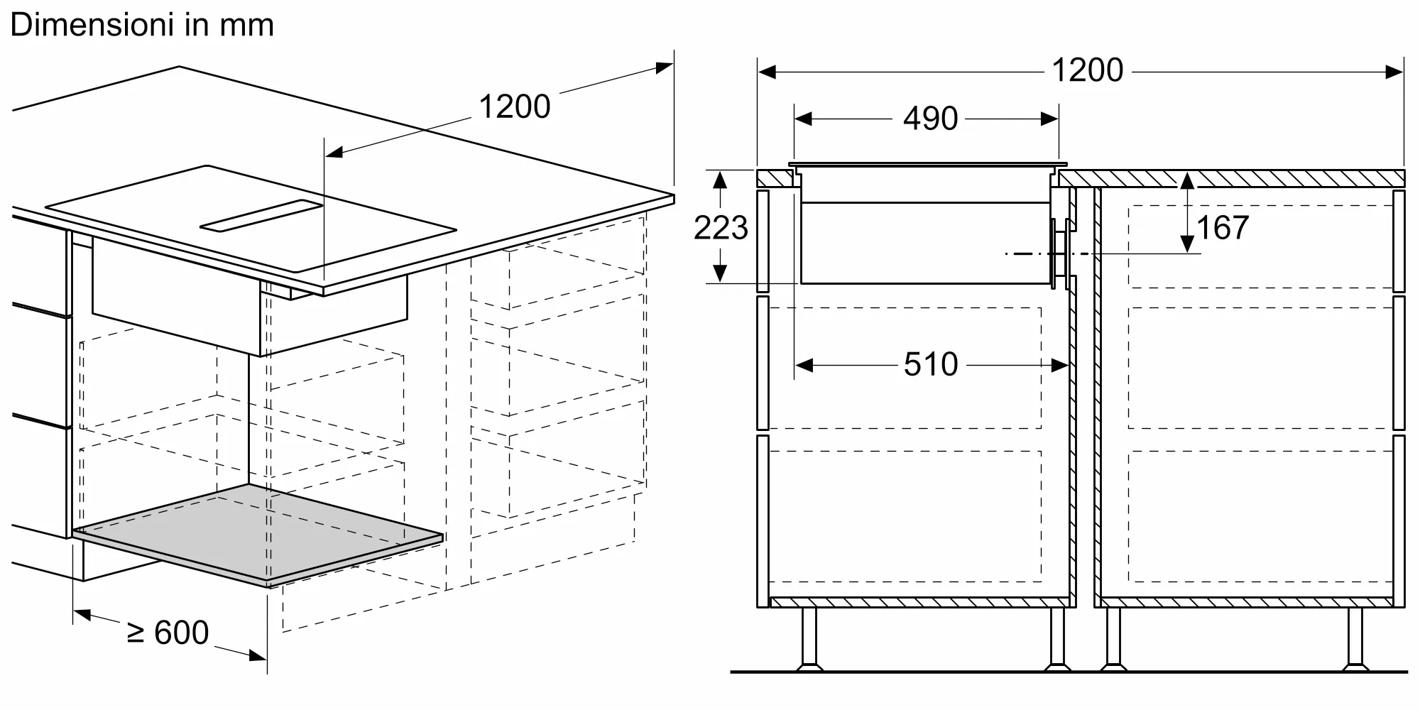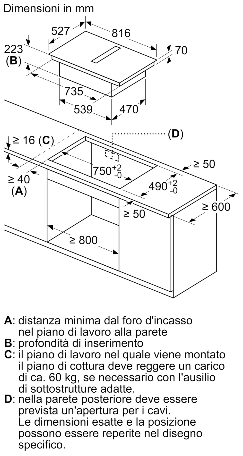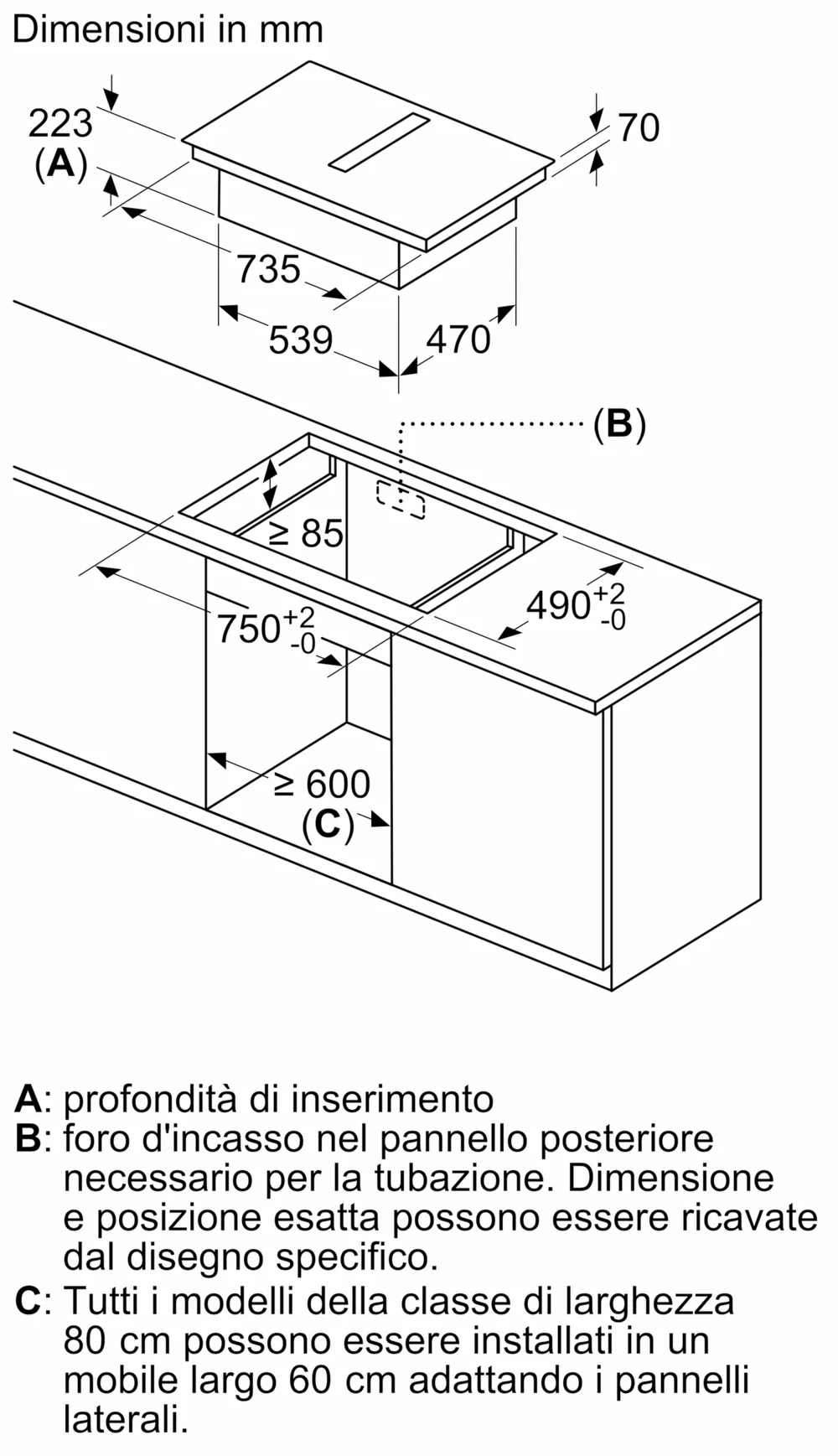 - Dimensioni di installazione (AxLxP mm) : 223 x 750 x (490 - 490)