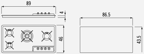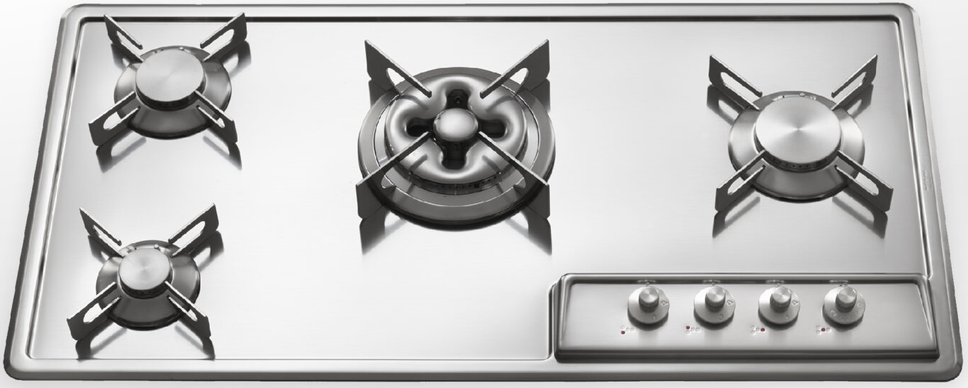 Descrizione: Piano cottura a gas valvolato incasso semifilo in acciaio inox a quattro fuochi di cu un bruciatore tripla corona, cm 89