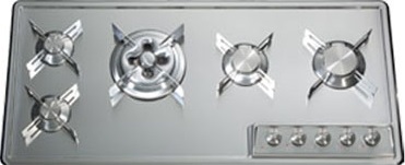 Descrizione: Piano cottura a gas valvolato incasso semifilo in acciaio inox a cinque fuochi di cui un bruciatore tripla corona, cm 99