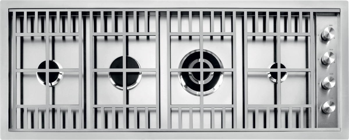 Descrizione: Piano cottura Lab a gas valvolato in acciaio incasso e filo, cm 120, 4 fuochi, comandi laterali