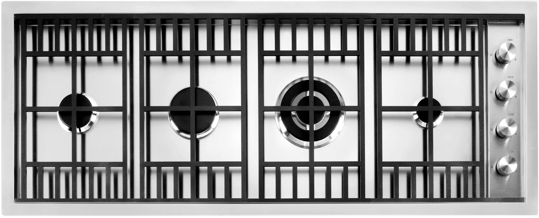 Descrizione: Piano cottura Lab a gas valvolato in acciaio incasso e filo, cm 120, 4 fuochi, comandi laterali