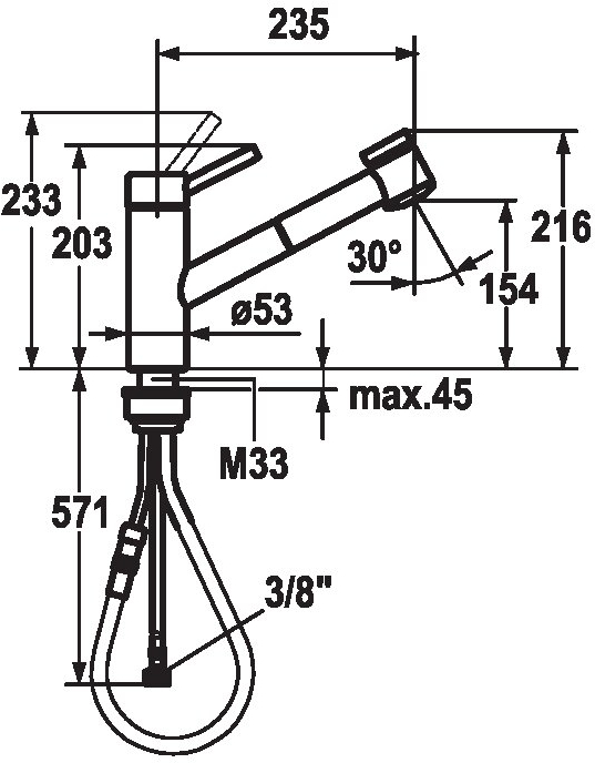 Descrizione: Miscelatore a leva, doccia estraibile, bocca orientabile fino a 130°, acciaio inox AISI