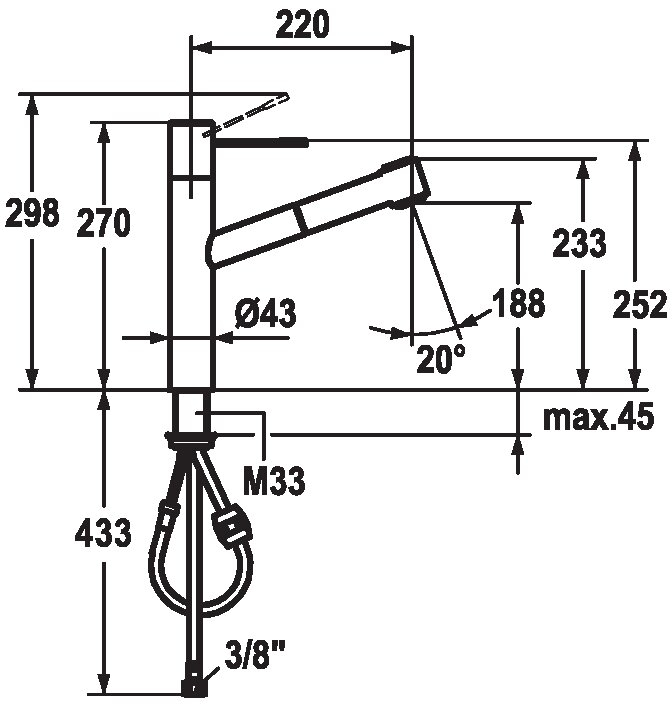 Descrizione: Miscelatore a leva, doccietta estraibile, bocca orientabile fino a 105°
