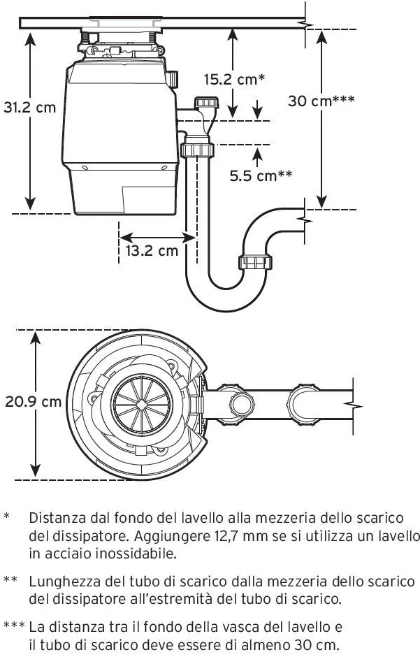 Il pulsante pneumatico, installato vicino al lavello, usa la pressione dell'aria per attivare il dissipatore (diametro foro per pulsante: 35 mm).